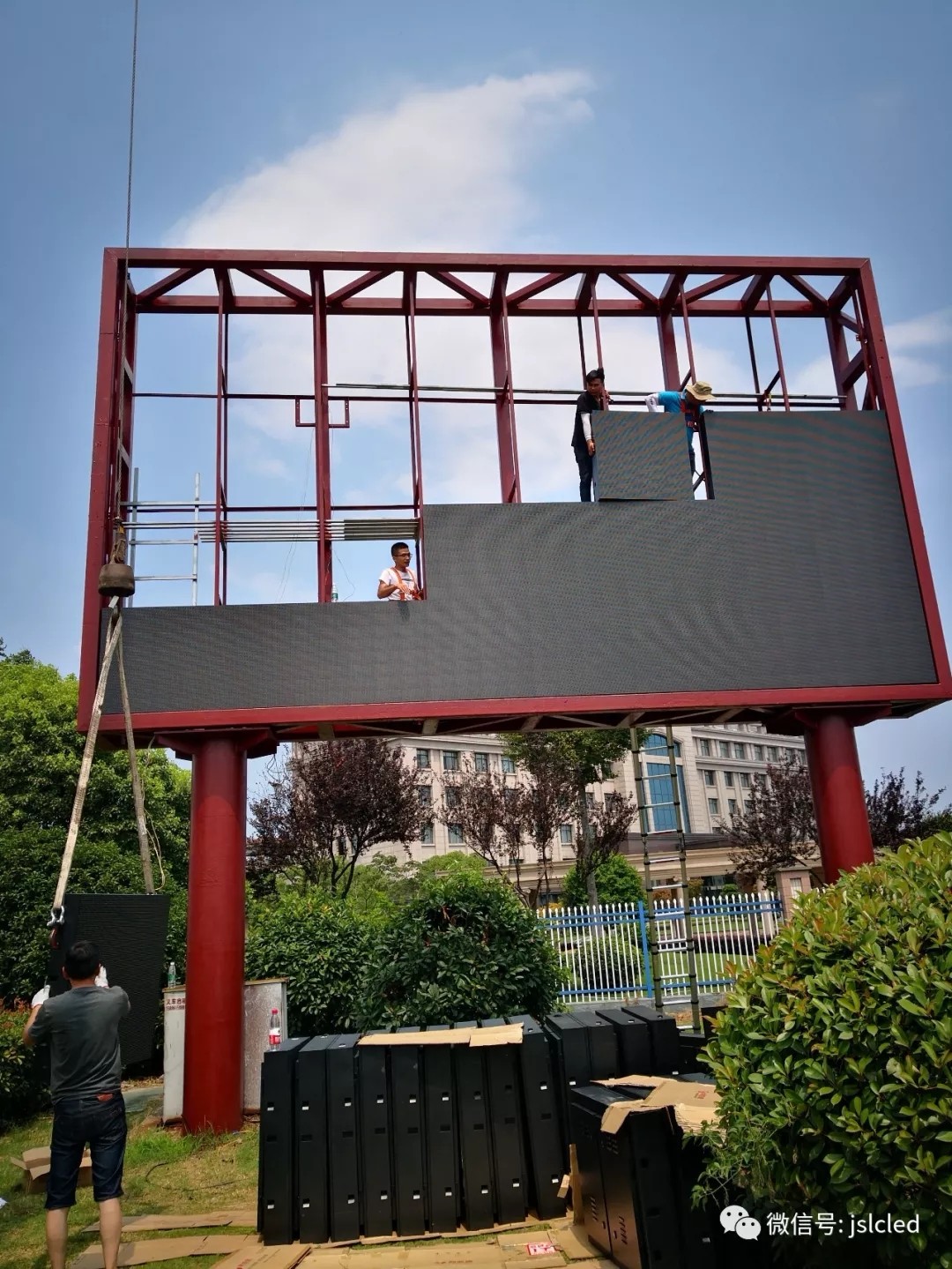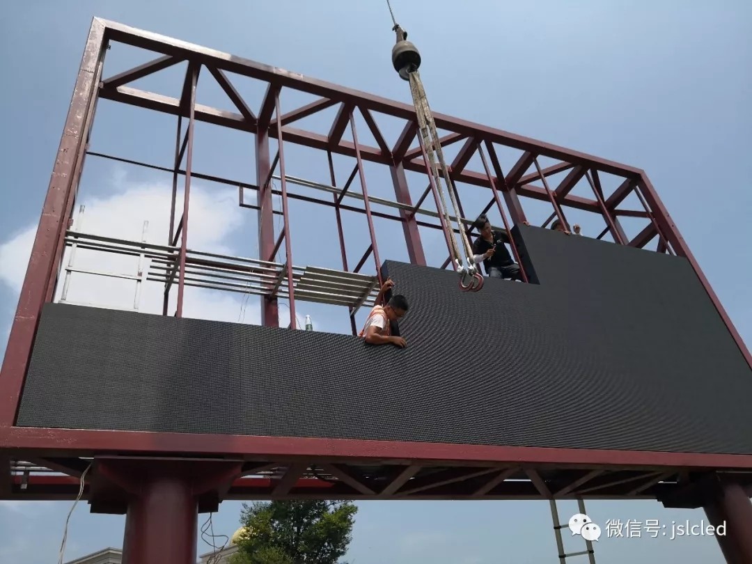 該項目由江蘇亮彩承制,負責該項目的鋼架結(jié)構(gòu)設(shè)計施工以及LED顯示屏顯示系統(tǒng)的整體構(gòu)建。正值盛夏,亮彩工程部也一絲不茍的完成的戶外顯示屏安裝工作,江蘇亮彩團隊始終不斷提升產(chǎn)品卓越性,完善售后服務(wù)以保障完美交付每一項顯示屏安裝工程。